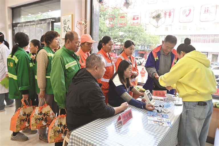 本報(bào)訊 (文/圖 記者 羅麗) “師傅,您的血壓有點(diǎn)偏高,平時(shí)要注意少鹽飲食,有空多活動(dòng)活動(dòng)腰。”9月26日上午,離石區(qū)交通路社區(qū)工會(huì)驛站內(nèi)暖意融融,社區(qū)衛(wèi)生服務(wù)中心的醫(yī)師們正為快遞小哥李鵬測量血壓,并耐心叮囑健康注意事項(xiàng)。當(dāng)天,交通路社區(qū)工會(huì)依托工會(huì)驛站陣地,組織開展“情暖中秋 健康相伴”主題活動(dòng),通過健康知識(shí)宣講、免費(fèi)義診及節(jié)日慰問,將關(guān)懷送到環(huán)衛(wèi)工人、快遞小哥、外賣騎手等戶外勞動(dòng)者心坎上,60余名勞動(dòng)者現(xiàn)場收獲“健康+節(jié)日”雙重溫暖。