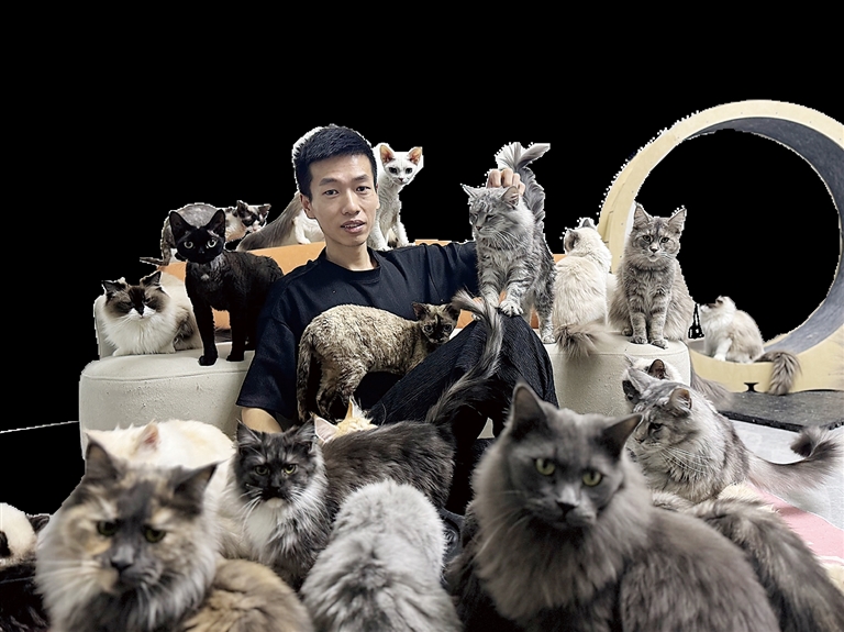 鏡頭里的他拍拍手喊“集合集合”,數(shù)十只毛色各異的貓咪聞聲從各個(gè)角落涌來(lái),有的蹭著他的褲腿撒嬌,有的跳上肩頭討要撫摸,原本安靜的屋子瞬間變得熱鬧又溫馨。直播間里“太酷啦”“好治愈”的評(píng)論不斷刷屏。